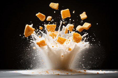 In a captivating display, colorful cereal pieces burst through the creamy liquid, creating dynamic splashes against a stark black background. The contrasting hues bring energy and vibrancy.