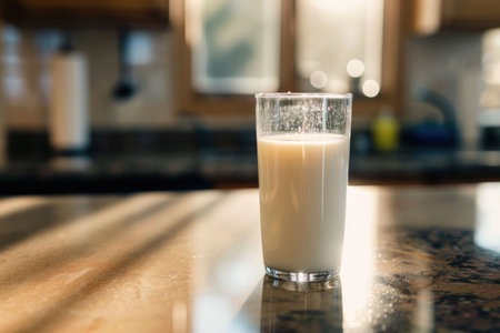 Glass of milk on a kitchen countertop with warm sunlight streaming in through a window