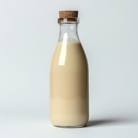 A glass bottle of oat milk with a cork top, standing on a white surface.