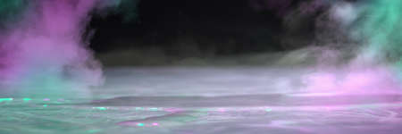 Dark street reflection on wet asphalt, fog, night city. Rays of neon light in the dark, neon light, smoke. Empty background scene. Abstract dark background.