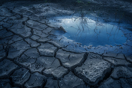 A cracked, dry ground with a small body of water. The water is reflecting the sky and the sky is cloudy