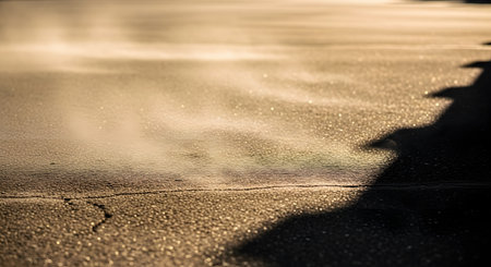 Steam or mist rises from a textured asphalt road surface, backlit by the intense golden light of a sunrise or sunset. The atmospheric shot emphasizes the heat and the grainy texture of the ground.