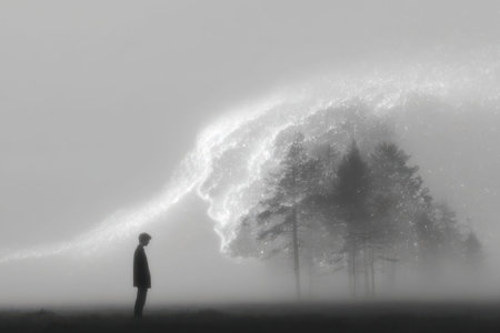 Silhouette of a person stands in fog, merging with an abstract landscape of trees and light