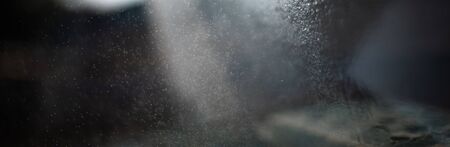 Abstract BANNER. Real Mystic smoke cloud with water drops blast, steam fly motion, dark background. Chemical experiment, aromatherapy, burn drink vapor paranormal fog. Yellow tone. More colour stock