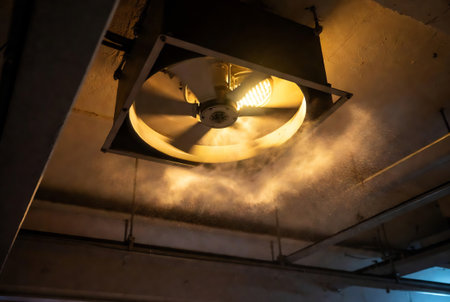 A dusty fan blade close-up, emphasizing indoor air pollution and the need for regular cleaning.