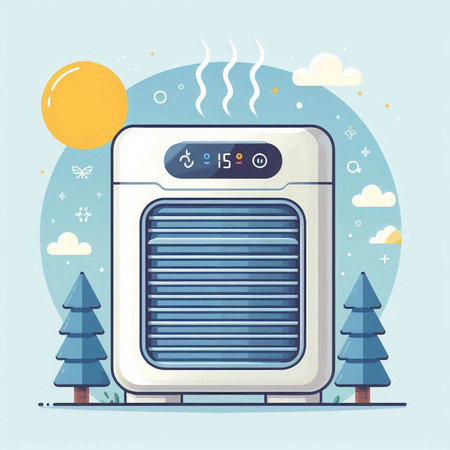 Portable air conditioner with happy face rolling on wheels, bringing cool relief on a hot yellow background