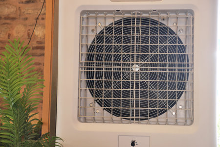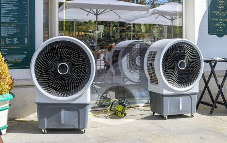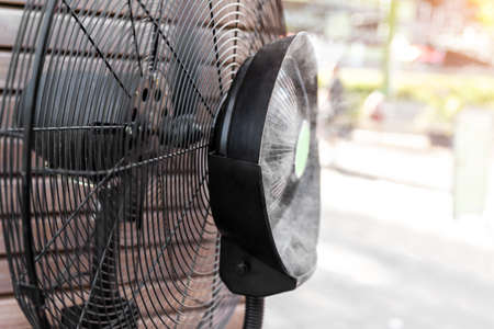 Close-up detail view of fresh moisturized breeze air blowing from big cooling fan machine hot sunny summer weather outdoors. Mist spraying ventilator system city street on heat season day