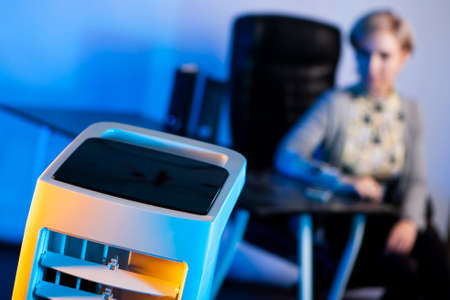 Air conditioning facilities. Outdoor air conditioning. Air purifier in the office. Humidifier. humidifier on the background of the office. Healthy work environment in the office. Air cleaning.