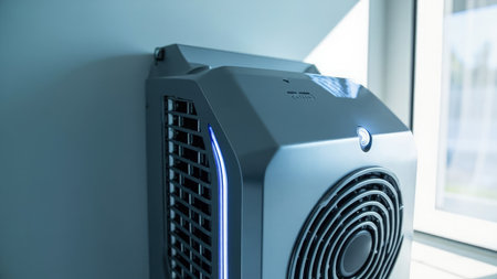 Sleek, modern wall-mounted air purifier enhances indoor air quality, promoting a healthy home environment. Its minimalist grey design complements any d