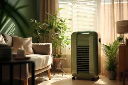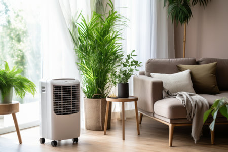 A powerful air conditioner cools a comfortably furnished room, providing relief from summer heat. The AC unit efficiently circulates cool, fresh air, showcasing its effectiveness in climate control and home comfort. Ideal for advertising HVAC systems, home appliances, or energy-efficient technologies.