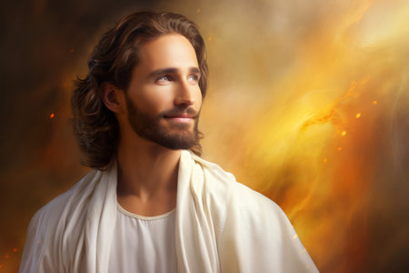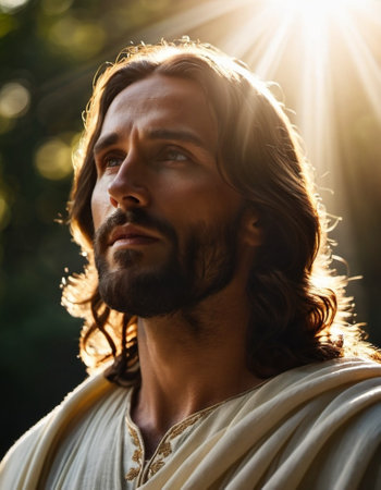 Portrait of Jesus Christ in his traditional white robe against sunset sky background.