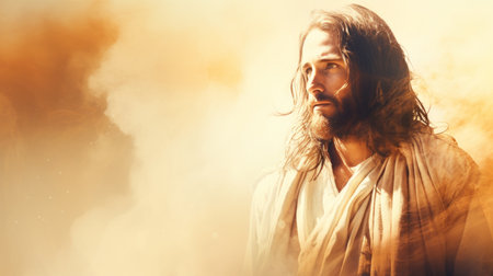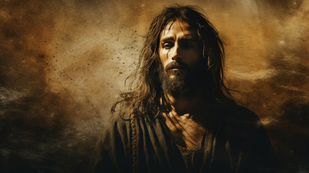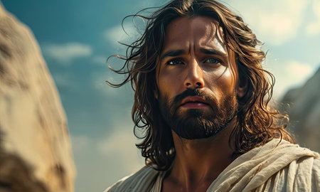 Portrait of Jesus Christ with long brown hair and beard in the desert