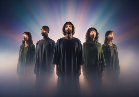 A group of diverse individuals stands with eyes closed in meditation, surrounded by ethereal swirling mist and illuminated by soft, radiant light, conveying peace and spirituality