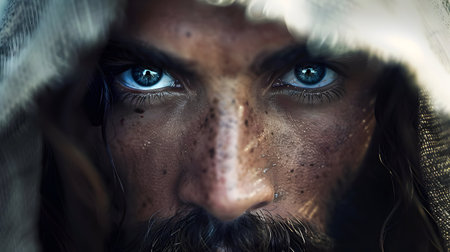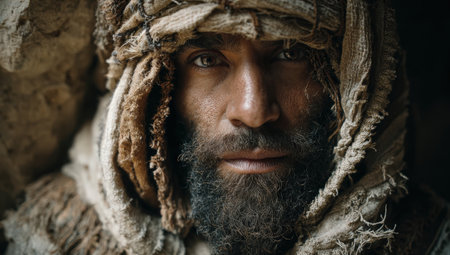 Man with a beard and headwrap gazes directly at the viewer, highlighting his rugged features and the textures of his clothing, evoking a sense of strength and endurance
