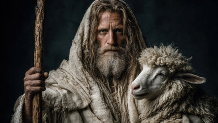 Man with long hair and beard, dressed in a robe, holds a staff and a sheep, creating a peaceful scene that emphasizes harmony with nature and companionship