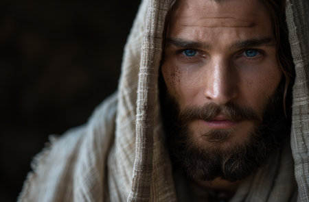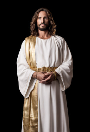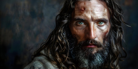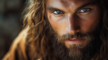 Close-Up Portrait of a Man Dressed as Jesus. White robe. Long brown hair and beard. Man appears to be in his early 30s, and he has a serious expression on his face. Christian religion and faith. AI.