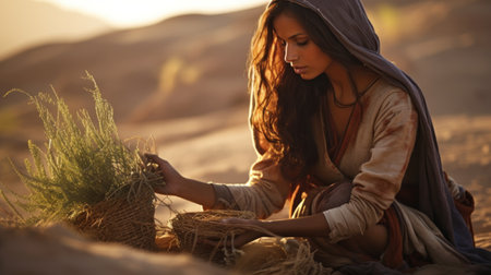 Young beautiful Bedouin woman collecting herbs and roots in desert areas.