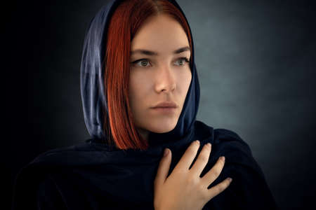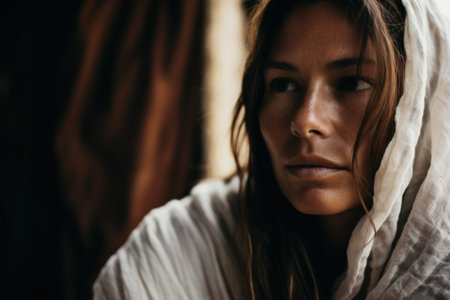 Biblical character, close up portrait of Biblical woman in scarf on the head looking up