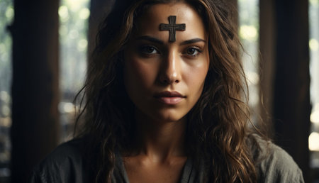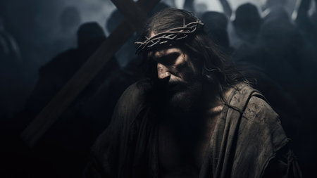A man wearing a crown of thorns stands solemnly in front of a cross, symbolizing sacrifice and redemption in Christian faith. The scene conveys a powerful message of suffering and salvation.
