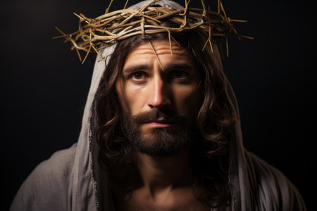 Jesus Christ wearing a crown of thorns and white chiton toga mantle cape himation suffering for mankind's sins in artistic mystical portrait