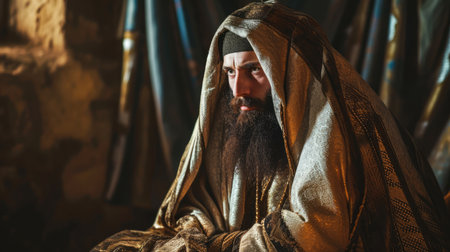 Portrait of a Patriarch in shawl sitting in the temple. Biblical character.