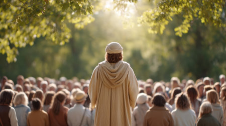 A serene scene depicting a figure in white robes addressing a diverse crowd in a lush outdoor setting, capturing themes of inspiration, community, and connection with nature.