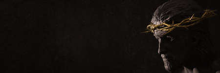 Jesus Christ with Crown of Thorns Black Gold Statue. Copy Space Banner 3D Rendering