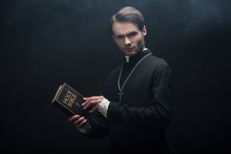 strict catholic priest holding holy bible and looking at camera on black background with smoke