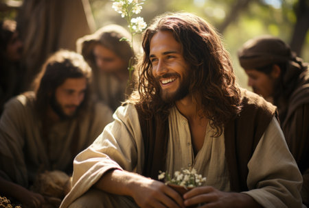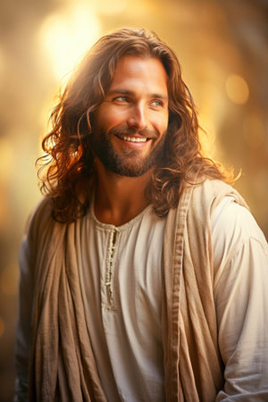 Jesus Christ smiling Savior of Humanity The Lamb of God who takes away the sin of the World Generative AI Illustration.