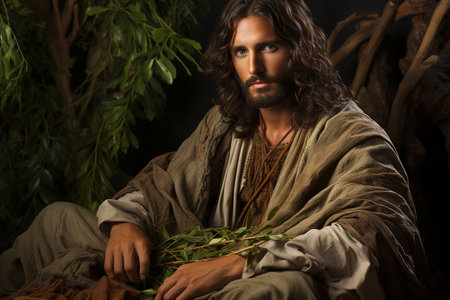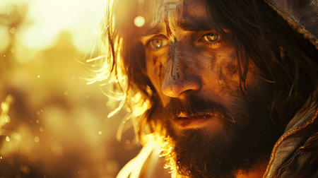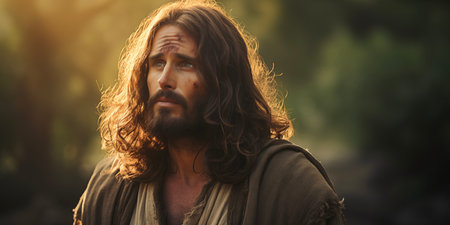 Portrait of Jesus Christ in the forest at sunset. Close-up.