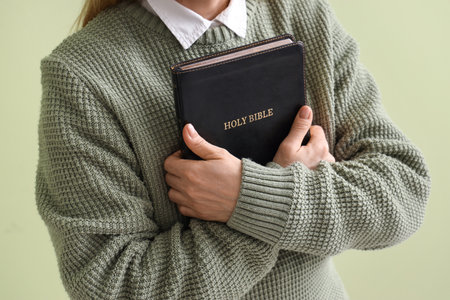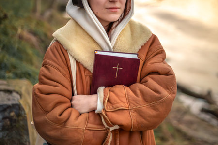 Christian teenage girl holds bible in her hands. Reading the Holy Bible in a field during beautiful sunset. Concept for faith, spirituality and religion. Peace, hope