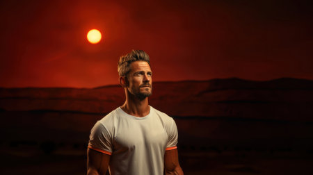 An intense portrait of a male tennis player, standing in a ready stance, with a vivid sunset and desert landscape in the background.