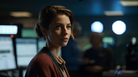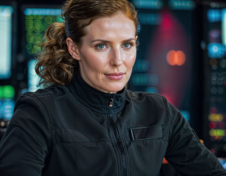 photo of beautiful woman as a commander agent wearing black long sleeve shirt and tactical pant with monitor and screen in control command room, generative AI