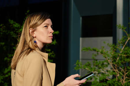 Beautiful Woman Using Smartphone At City Street, Caucasian Female Portrait Using Mobile Phone