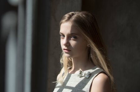 Pretty girl or young woman, teenager, with stylish, blond, long hair in fashion grey dress standing on sunny, summer day. Relaxing outdoors