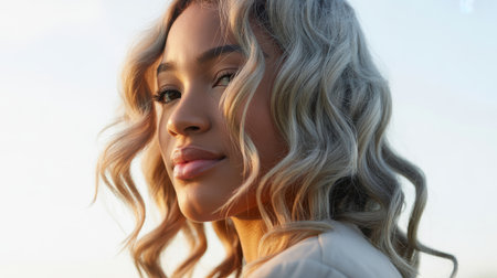 Confident young woman with long wavy blonde hair standing outdoors in soft natural sunlight, gazing thoughtfully at the camera.