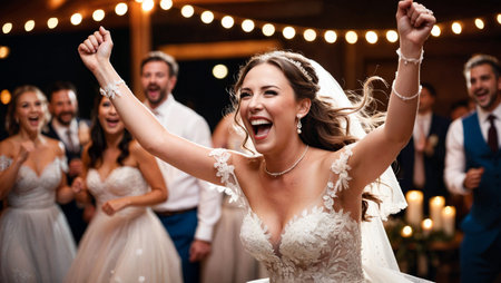 Ecstatic bride with arms raised, laughing during wedding celebration while guests share the moment. Perfect for wedding photography, bridal services, event planning, and wedding venue advertising.
