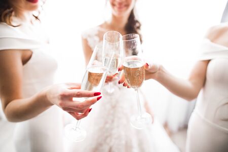 Totally happy Top view of attractive young bride clicking glasses with her beautiful bridesmaids while standing in the fitting room : Generative AI