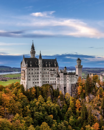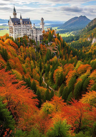 Aerial view of Neuschwanstein Castle surrounded by vibrant autumn trees in the Bavarian Alps
