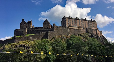 High resolution large panoramic view of Edinburgh castle at sunset in Edinburgh, UK
