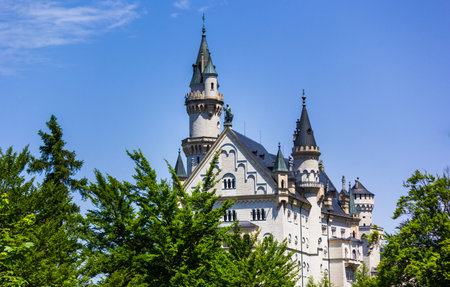 Bavaria, Germany. The fabulous Neuschwanstein Castle in the Bavarian Alps. Scenic view of the green forest trees. The famous Neuschwanstein tourist center is a landmark