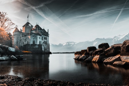 Montreux, Switzerland - September 20, 2018: Montreux, Switzerland - September 20, 2018: Courtyard of Chillon castle on lake Geneva near the city of Montreux and tourists there during sunset