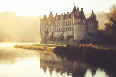 A stunning castle overlooks a calm river, surrounded by mist and the soft glow of early morning light.