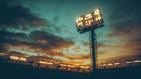 A captivating view of a sports stadium featuring bright floodlights against a colorful sky at dusk, creating a stunning backdrop for various events.