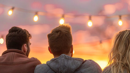 Friends are watching a sunset from a rooftop while string lights provide soft lighting during a warm evening sky. They enjoy each other's company and the view.