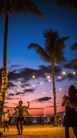 A group of people playing beach volleyball under the lights, with the sound of the waves