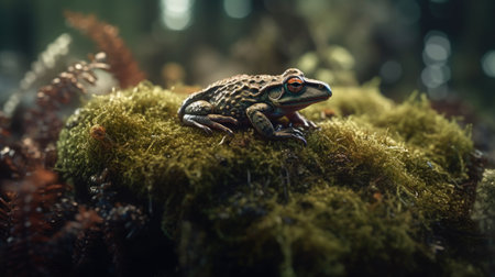 An AI generated illustration of a poison dart frog on a bed of mossy terrain