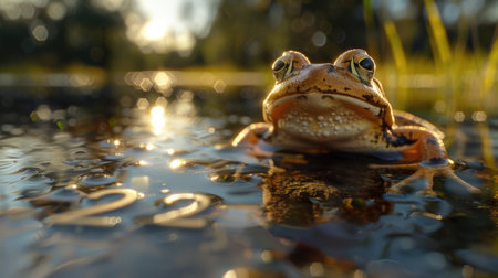 A frog perched on the surface of the water, showing its natural adaptation to aquatic environments.