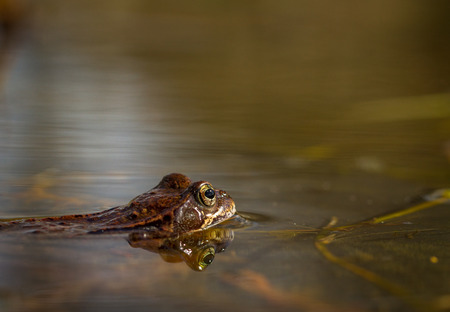 Common frog, Rana temporaria, in a garden pond in Norway. View from the side, reflection of frog in water. April, spring