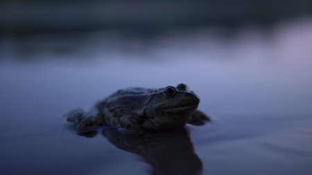 Frog in a small river on a sunny summer day. Side view.
